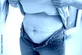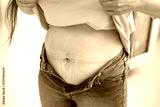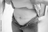 Postpartum belly, Post-baby body, stretch marks, woman's abdomen, woman unbuttoning jeans, skin texture, motherhood, body positivity