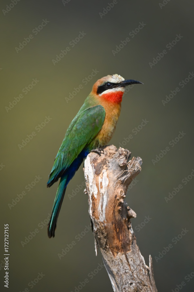 White-fronted bee-eater turning head on dry log