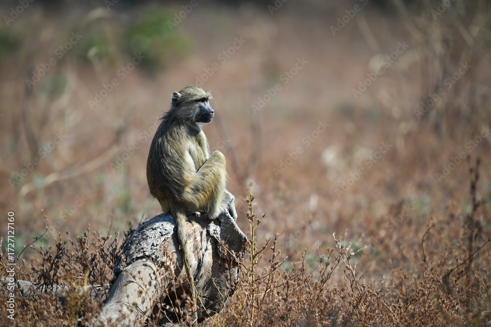 Yellow baboon sits on log in bushes
