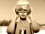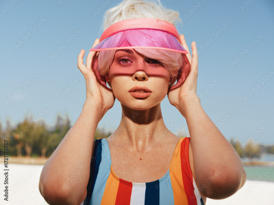 Young woman wearing a rainbow striped swimsuit and pink visor stands on a sunny beach, delivering bold colors, confident pose, and a playful summer vibe.