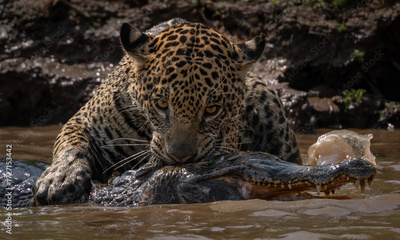 Jaguar hunting for caiman in Pantanal, Brazil