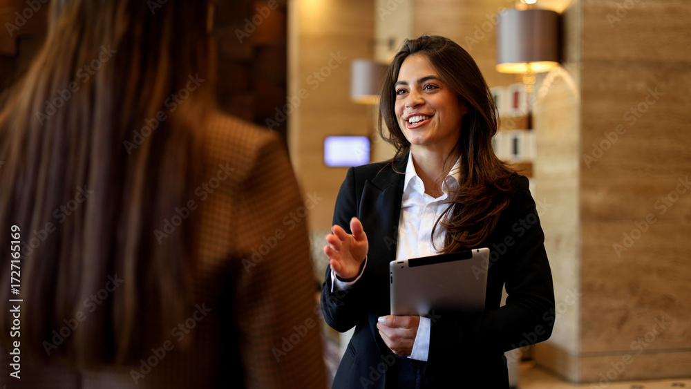 Businesswoman talking with colleague, holding digital tablet in modern office or hotel lobby, smiling during discussion