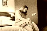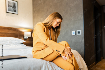 Businesswoman sitting in a hotel room on the bed and massages her tired legs after long day.