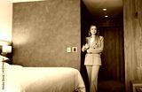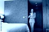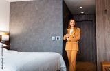 Businesswoman walking into a hotel room holding a laptop in her hands.