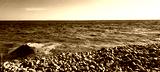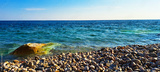 Scenic view of a rocky seashore with clear turquoise water, sunlit waves, and submerged stones creating a vibrant coastal landscape under a bright sky.