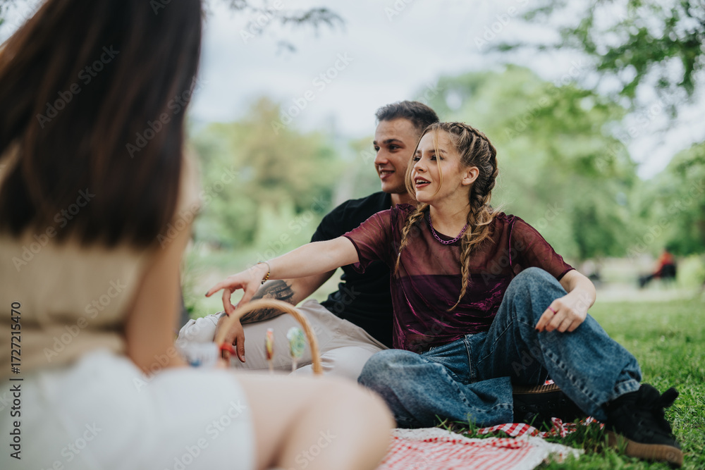Group of young friends with cheerful expressions enjoying their time together outdoors, sitting on a picnic blanket in a lush, green park. Captures the joy of social connections in a natural setting.