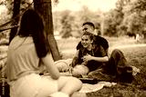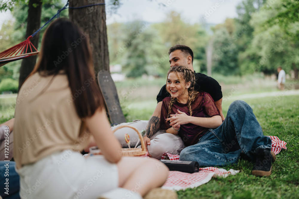 Friends gathered in a park, enjoying a relaxing and cheerful picnic experience on a sunny day.