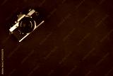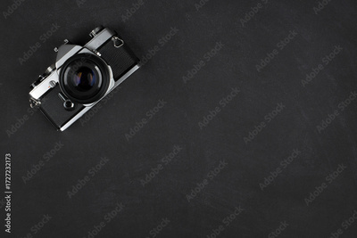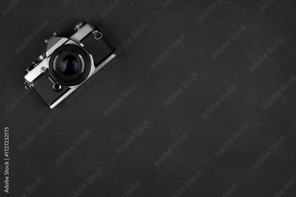 Retro Photo Camera Top View Flat Lay on Black Textured Background with Copy Space