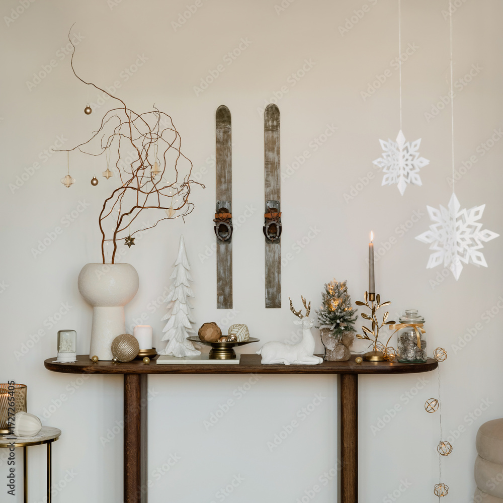 Decorative console with vintage skis, sculptural vase, white tree, reindeer and gold leaf candle; delicate ornaments set a refined Christmas mood.