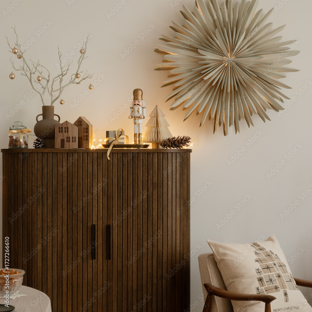 Warm cabinet styling with nutcracker, wooden houses and gold lights beneath a champagne paper starburst an elegant, cozy Christmas vignette.