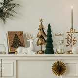 Festive cabinet styling with white reindeer, golden candle holder, Christmas tree decor, ornaments, and glowing holiday lights.