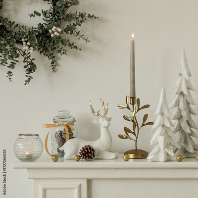 Festive mantel decorated with white reindeer figurines, gold candleholders, and seasonal greenery. A chic and minimalist holiday scene with warm and elegant details.