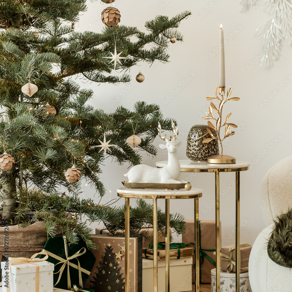 Christmas living room featuring a decorated tree, cozy textiles, and elegant golden accents. A serene and inviting holiday ambiance perfect for seasonal inspiration.