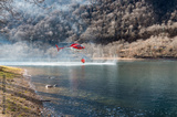 Helicopter Collecting Water from Lake Ghirla to Fight Forest Fires in Valganna, province of Varese, Lombardy, Italy