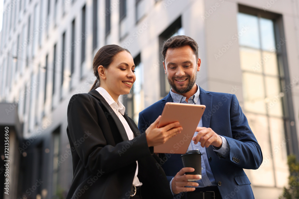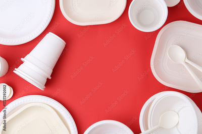 Set of disposable plastic tableware on red background, flat lay. Space for text