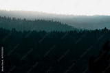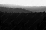 Silhouettes of trees in the fog, a forest area in the distance.