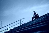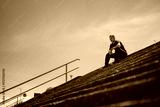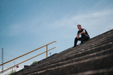 A man wearing a black athletic outfit sits thoughtfully on concrete steps under a bright sky.