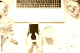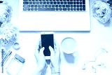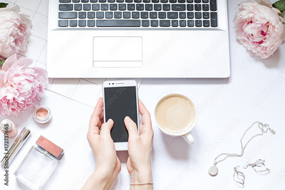 Beauty flat lay with a laptop and flowers. Woman's hands hold a phone and a cup of coffee. Top view composition.