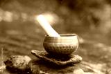 Tibetan singing bowl with mallet on stone near river