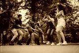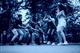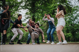 Friends gathers outside, engaging in energetic, joyful activities amidst nature. The vibrant atmosphere highlights the bond and carefree moments shared among companions in a peaceful rural setting.
