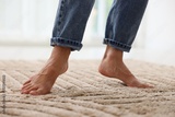 Woman walking barefoot on soft beige carpet at home, closeup