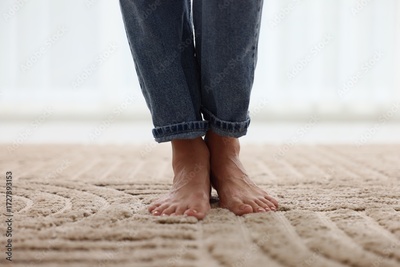Woman barefoot on soft beige carpet at home, closeup