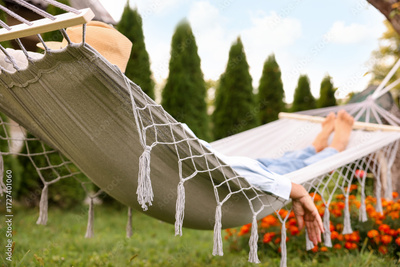 Senior woman resting in hammock outdoors, selective focus