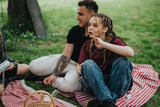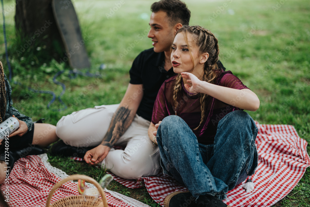 A group of friends sitting on a red checkered picnic blanket, enjoying casual conversations and laughter in a lush green park setting on a sunny day.