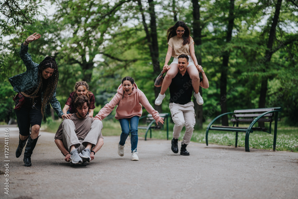 A lively group of young adults enjoys playful moments and activities in a serene park atmosphere, sharing laughter, energy, and companionship amidst nature.