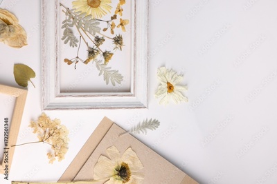 Beautiful dry flowers, green leaves and picture frame on white background, flat lay. Space for text