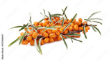 Fresh sea buckthorn berries with green leaves isolated on white