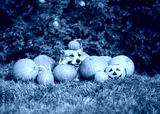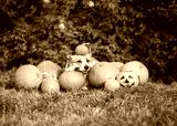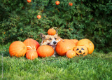 a funny corgi dog lying in the autumn garden among orange pumpkins on Halloween and holding one vegetable on his head