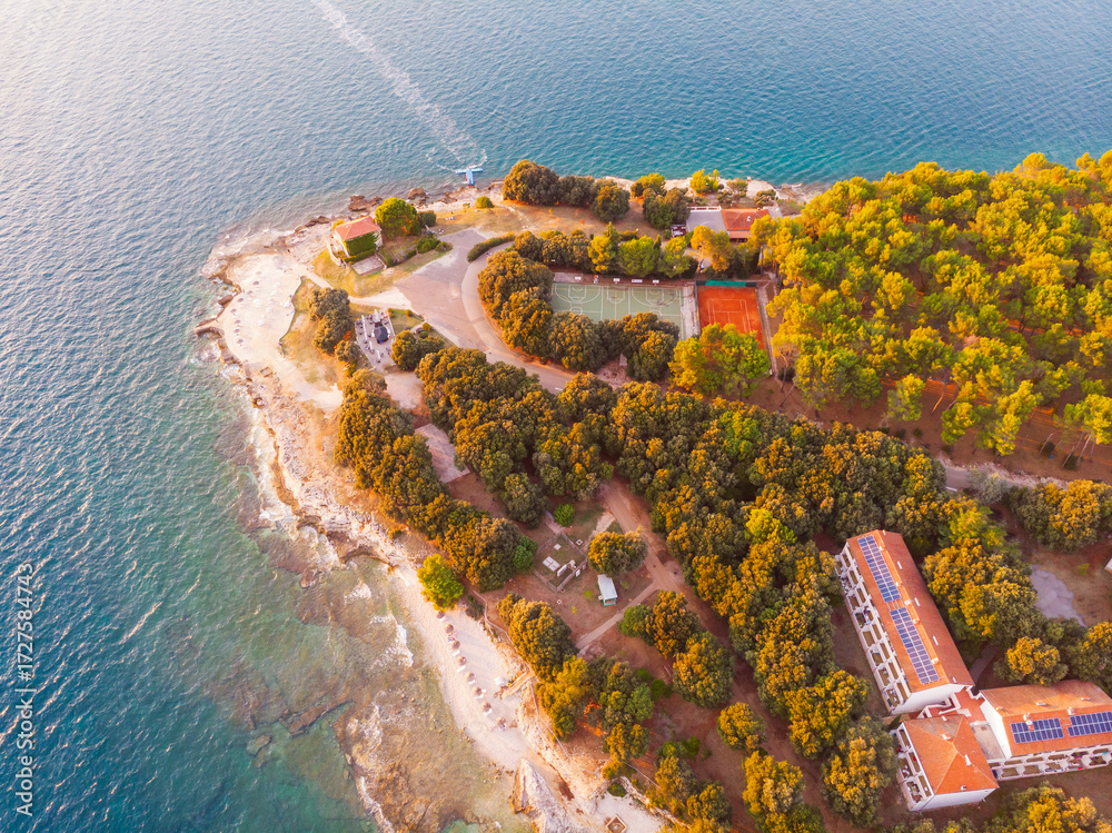Aerial drone shot of rocky coast of Istrian peninsula with beautiful blue Adriatic sea at sunset