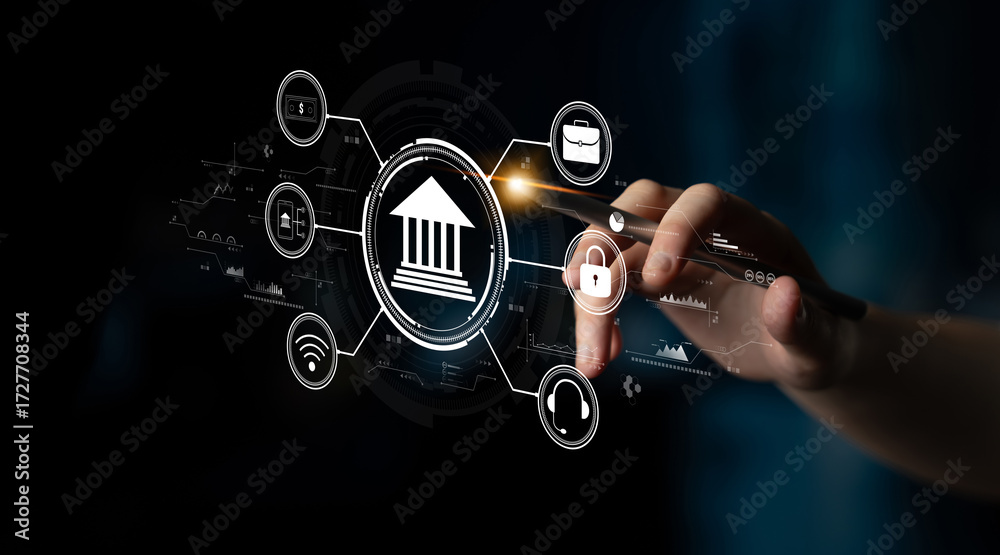 A concept of digital banking and online financial technology (FinTech) services. A central platform for secure transactions, support, and business finance. Motif
