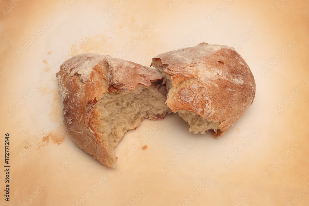 Fresh home handmade broken Ciabatta Baked Bread on beige background.