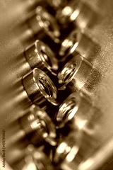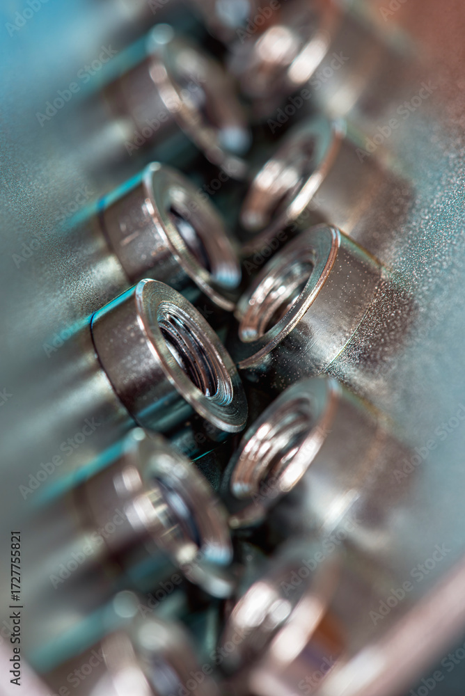 Steel plate and threaded holes, raw metal texture and light, in close-up