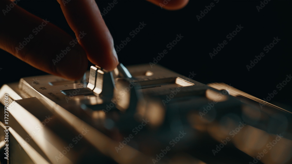 Music listener turning player touching switches at vintage panel in room closeup