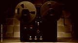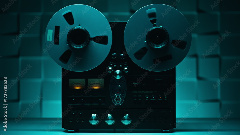 Reel spinning recorder retro studio delivering nostalgic mood. Hand adjusting