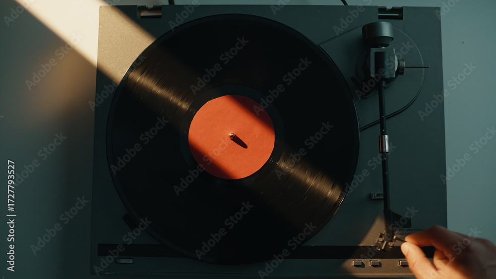 Man taking vinyl disc from gramophone at home closeup. Hand turning off play