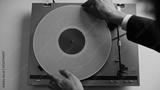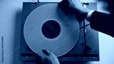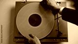 Hands putting vinyl disc at vintage gramophone placed on table closeup top view