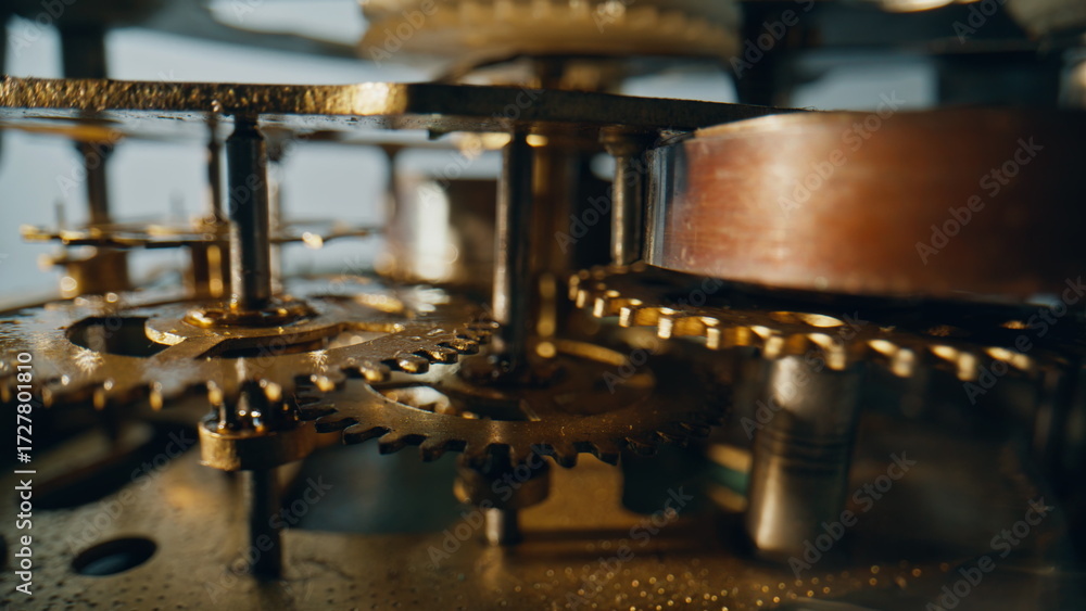 Internal cogs shifting clock compact mechanism closeup. Macro brass structure