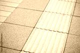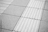 Tactile paving surface with raised grooves for blind guidance. Concrete textured tiles with accessibility pattern. Photo