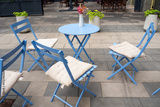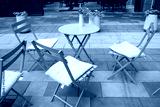 Small round table with blue chairs in outdoor cafe space. Real photo