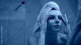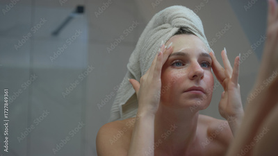 A woman applies skincare in the mirror, highlighting her morning routine in a chic bathroom.
