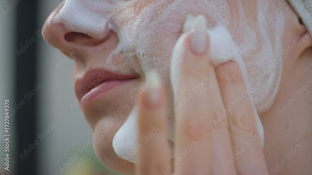 A woman gently cleanses her face with a foaming cleanser, focusing on skincare in a relaxed setting during the day.