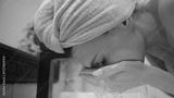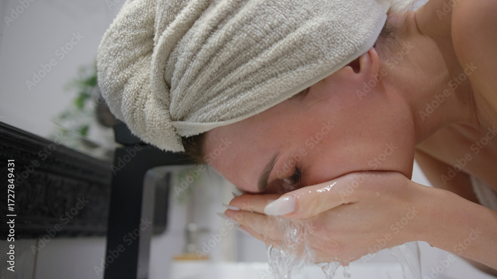 A woman with a towel on her head is washing her face at a bathroom sink, focusing on her skincare routine.