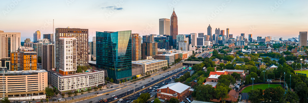 Atlanta city skyline at sunset with highways and modern downtown buildings