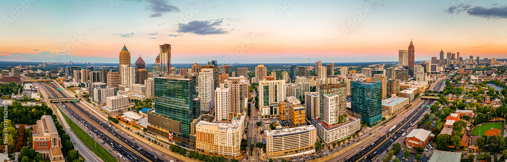 Atlanta city skyline at sunset with highways and modern downtown buildings