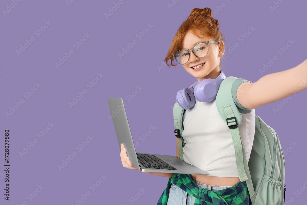 Cute schoolgirl with modern laptop and headphones taking selfie on lilac background