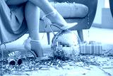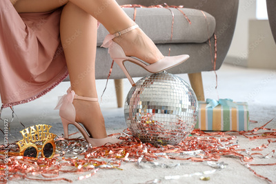 Legs of woman with tinsel and disco ball at home after Birthday party